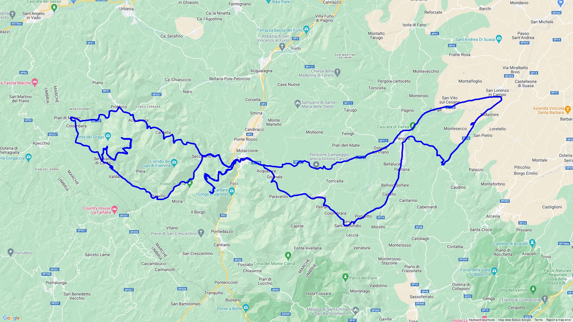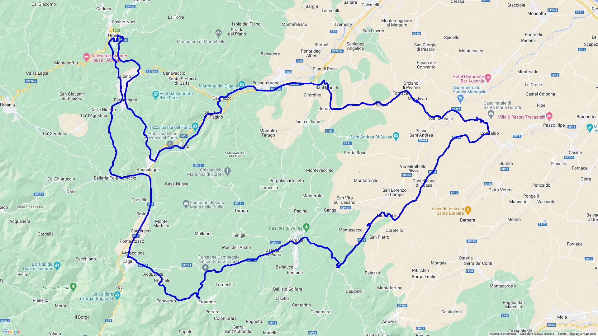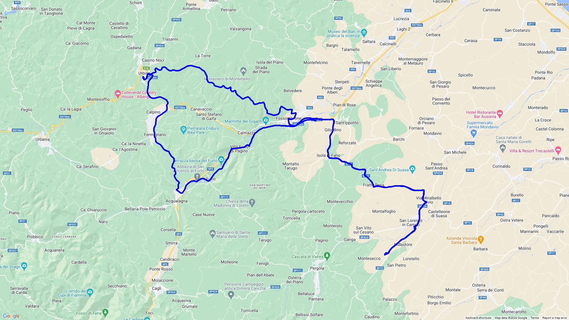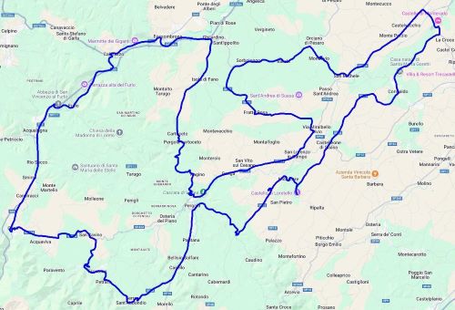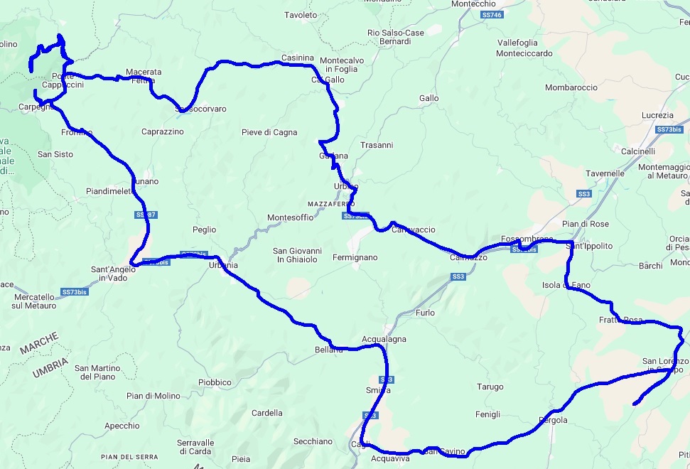 Eine Rundtour über Corinaldo, eines der schönstgelegenen Dörfer Italiens, nach Mondavio einer Festungsstadt. Danach geht es durch die imposante Furloschlucht ( via Flaminia ) nach Urbino, einer alten Universitätsstadt mit einer der jüngsten Bevölkerung in Italien. Hier laden viele Gelaterien und Bars zum Verweilen und Beobachten ein. Zurück geht es über Fermignano und Cagli auf die Rocca di Frontone mit einer Traumaussicht auf den Apennin.