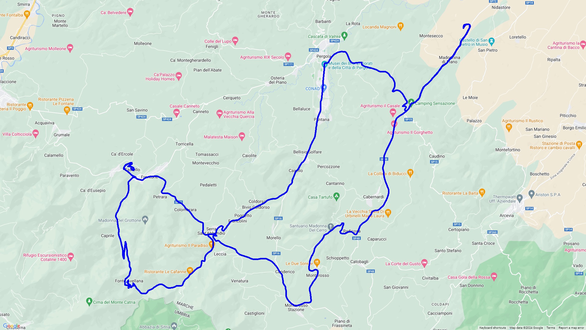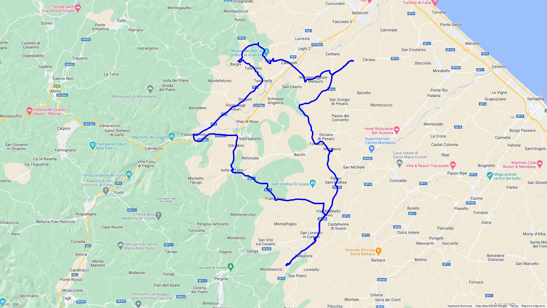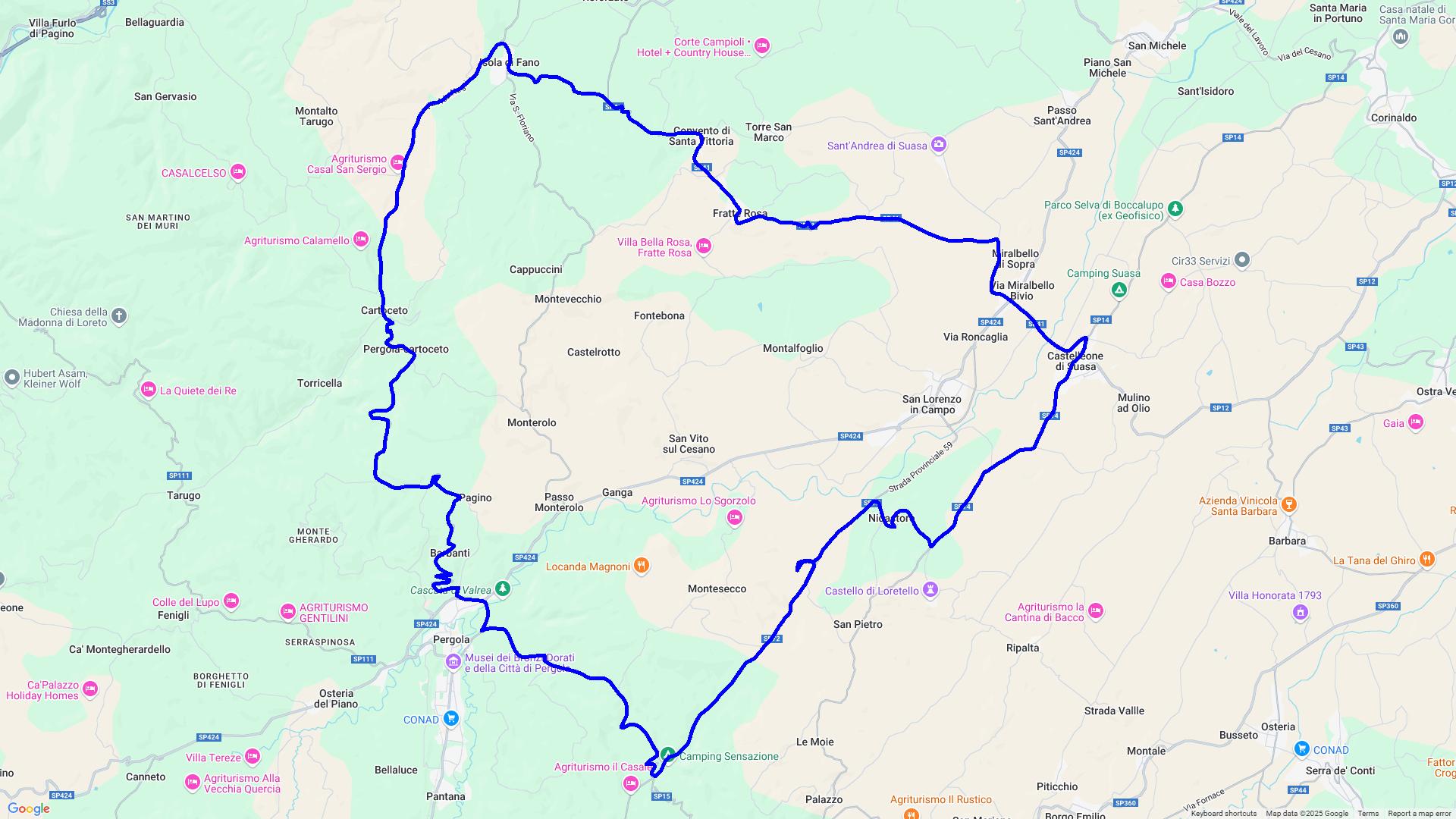 Eine Rundtour über Corinaldo, eines der schönstgelegenen Dörfer Italiens, nach Mondavio einer Festungsstadt. Danach geht es durch die imposante Furloschlucht ( via Flaminia ) nach Urbino, einer alten Universitätsstadt mit einer der jüngsten Bevölkerung in Italien. Hier laden viele Gelaterien und Bars zum Verweilen und Beobachten ein. Zurück geht es über Fermignano und Cagli auf die Rocca di Frontone mit einer Traumaussicht auf den Apennin.
