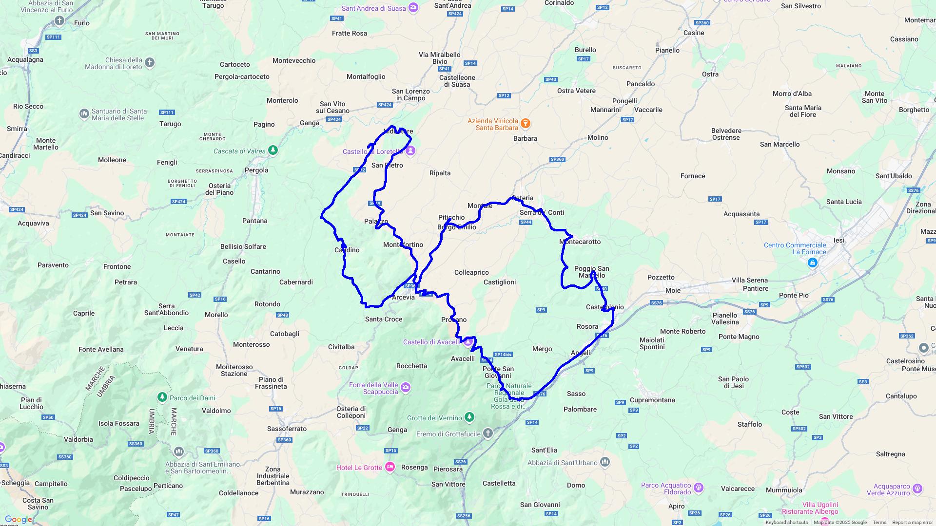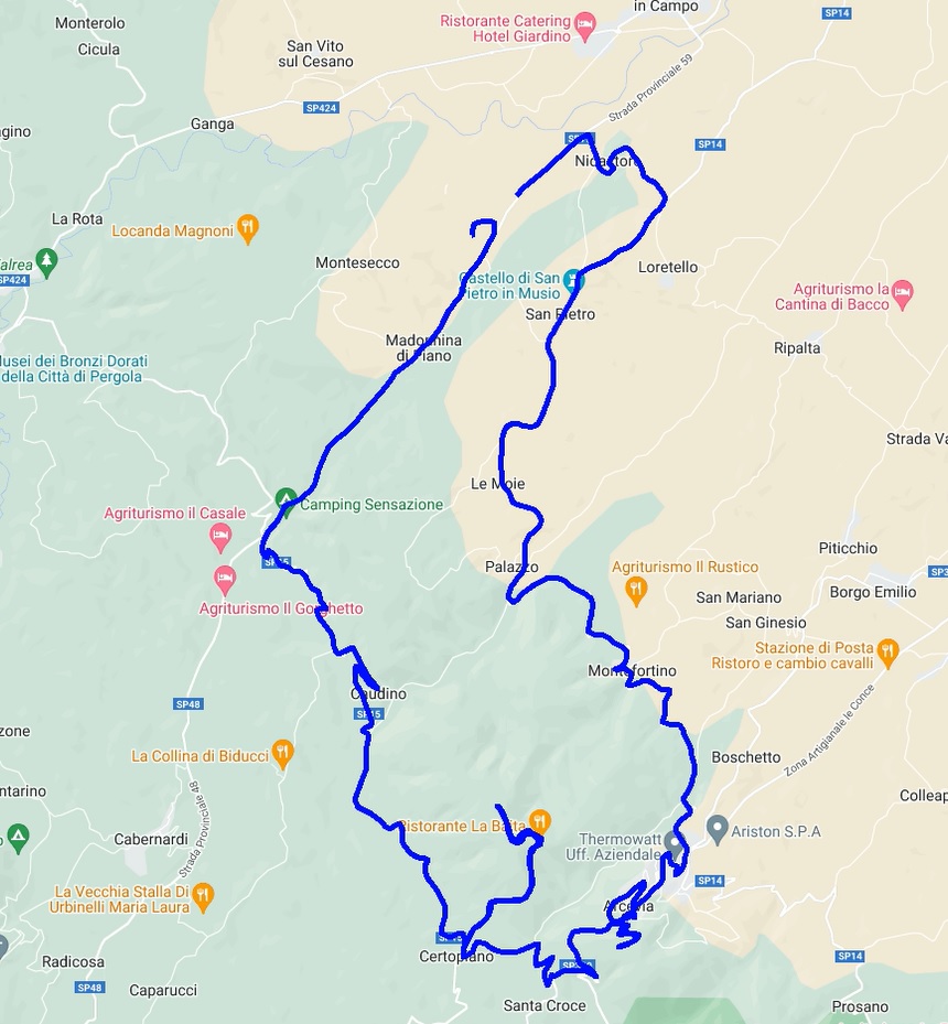 Eine kleine Runde in der näheren Umgebung zum Kennenlernen der Straßen, Auffahrt auf den Monte Sant Ángelo ( 796m ) - herrlicher Rundumausblick - dann zum Monte della Croce ( 650m ) und anschließend in die Bergstadt Arcevia mit der Möglichkeit eines Eis-Stopps.