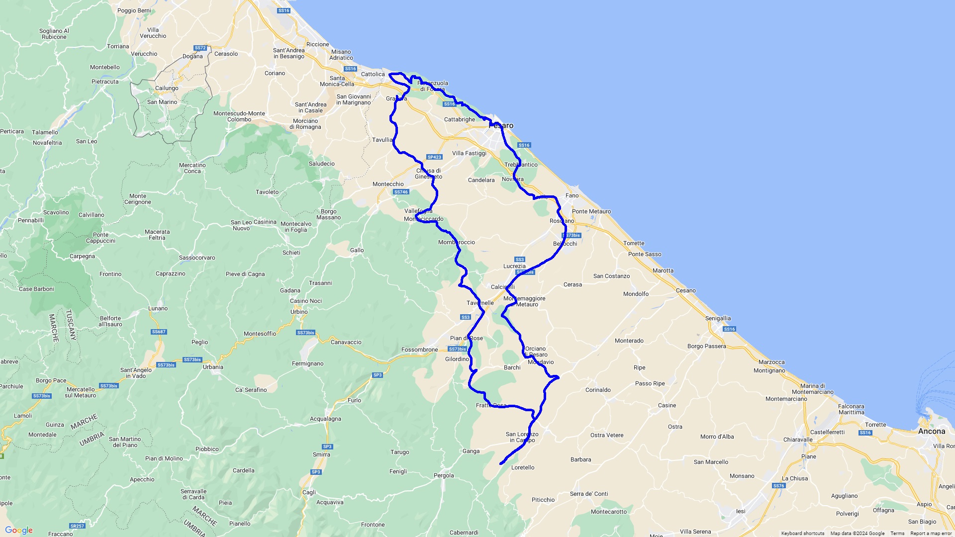 Route führt über die Hügel der Marken nach Gradara und Gabicce Mare danach entlang der Panoramica Addriatice nach Pesaro für einen kleinen Stadtrundgang.